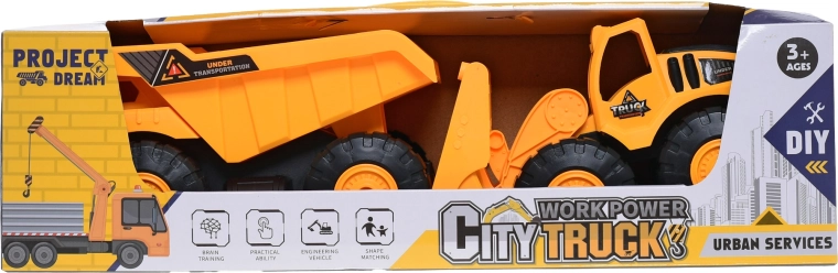 Deze set met twee bouwvoertuigen bezorgt kinderen een authentieke bouwervaring. De graaflaadmachine met beweegbare bak en de kieptruck met kantelbare laadbak ondersteunen de ontwikkeling van de motoriek, coördinatie en creatief spel. Dankzij de stevige kunststof en de vrijloop zijn de voertuigen eenvoudig te bedienen en rijden ze soepel over verschillende ondergronden.