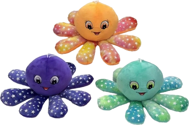 Deze zachte pluchen octopus is ontworpen voor veilig knuffelen en de eerste ontdekkingen. Het zachte oppervlak voelt prettig aan en is vriendelijk voor de gevoelige kinderhuid. Dankzij de fosforescerende materialen licht het speeltje op na blootstelling aan licht en creëert het een rustige sfeer in het donker.