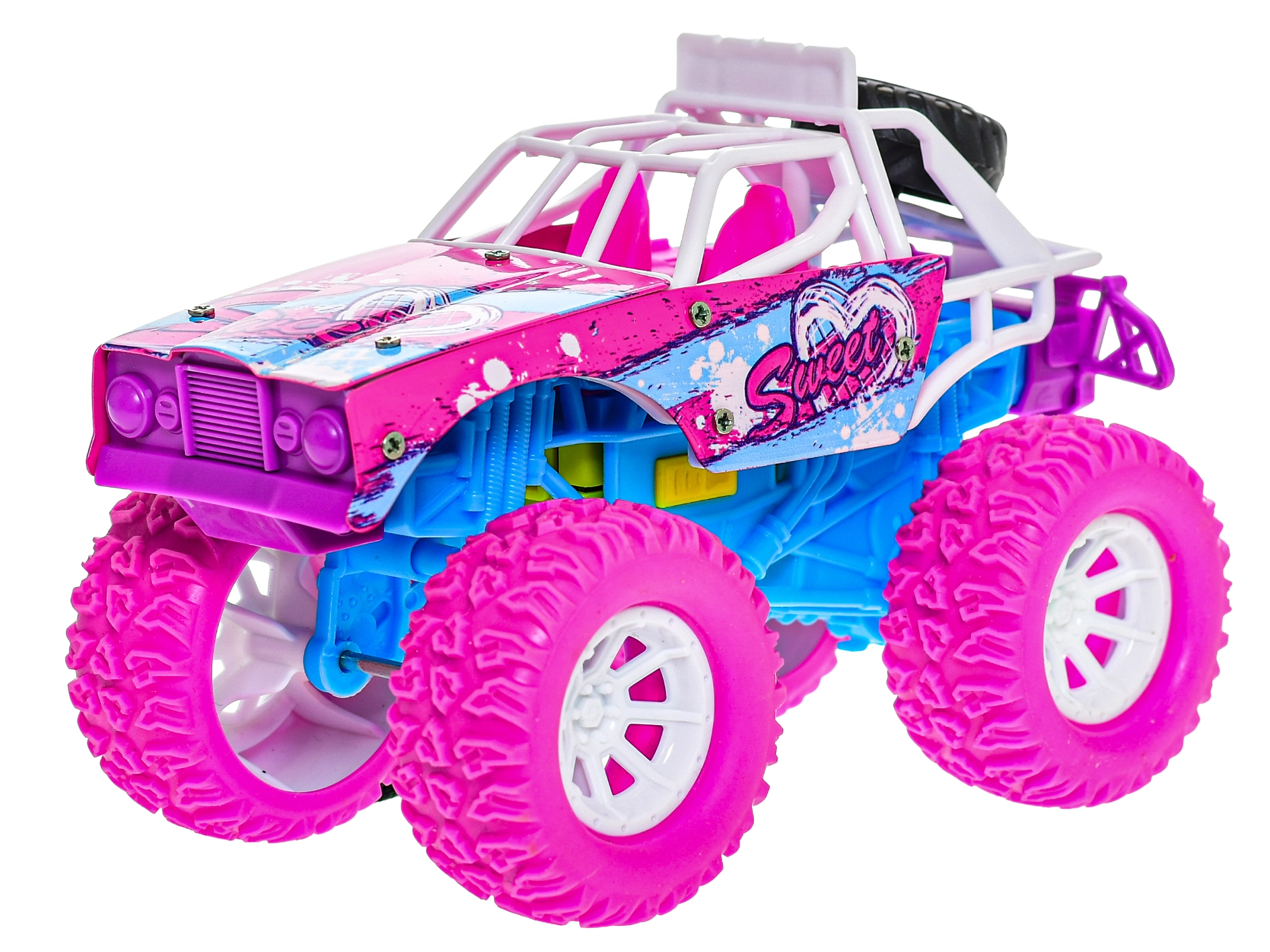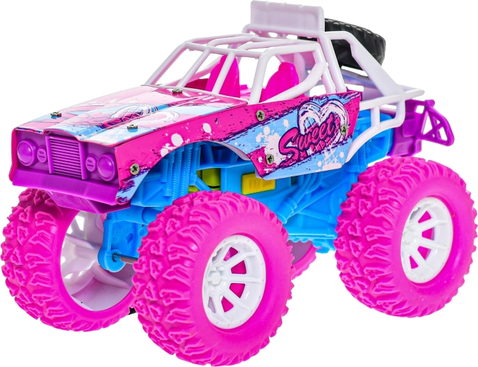 Ontdek grenzeloos speelplezier met een terreinwagen die realistische vliegwielaandrijving combineert met een stevige constructie van metaal en kunststof. Dankzij de aantrekkelijke roze‑blauwe kleurencombinatie en de grote wielen genieten kinderen van dynamische ritten, zowel binnen als buiten.