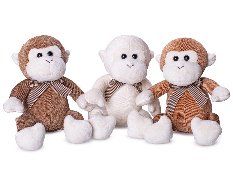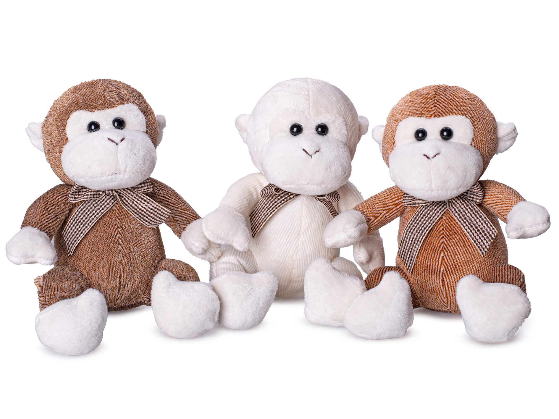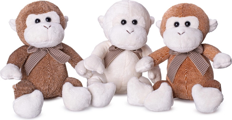 Er zijn drie stijlvolle kleuren om uit te kiezen – beige, lichtbruin en donkerbruin – elk aangevuld met een elegante strik die het speeltje extra charme geeft. Het aapje is in een doos verpakt, dus klaar als cadeau voor een verjaardag, Kerstmis of gewoon zomaar.