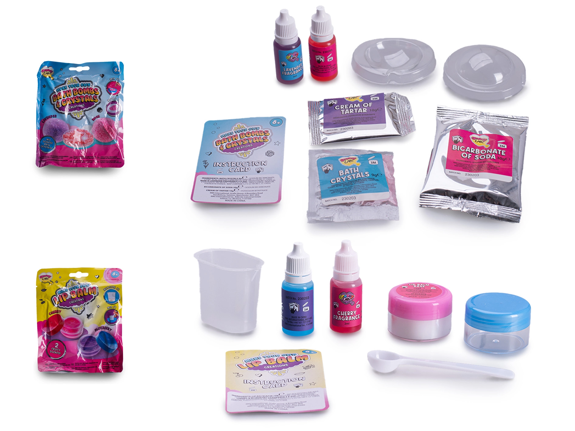 In de verpakking vind je een complete set ingrediënten en hulpmiddelen voor het maken van een lippenbalsem of een bruisende badbom. De werkwijze is ontworpen om veilig en begrijpelijk te zijn voor kinderen vanaf 8 jaar en ontwikkelt tegelijkertijd handvaardigheid, geduld en oog voor detail.