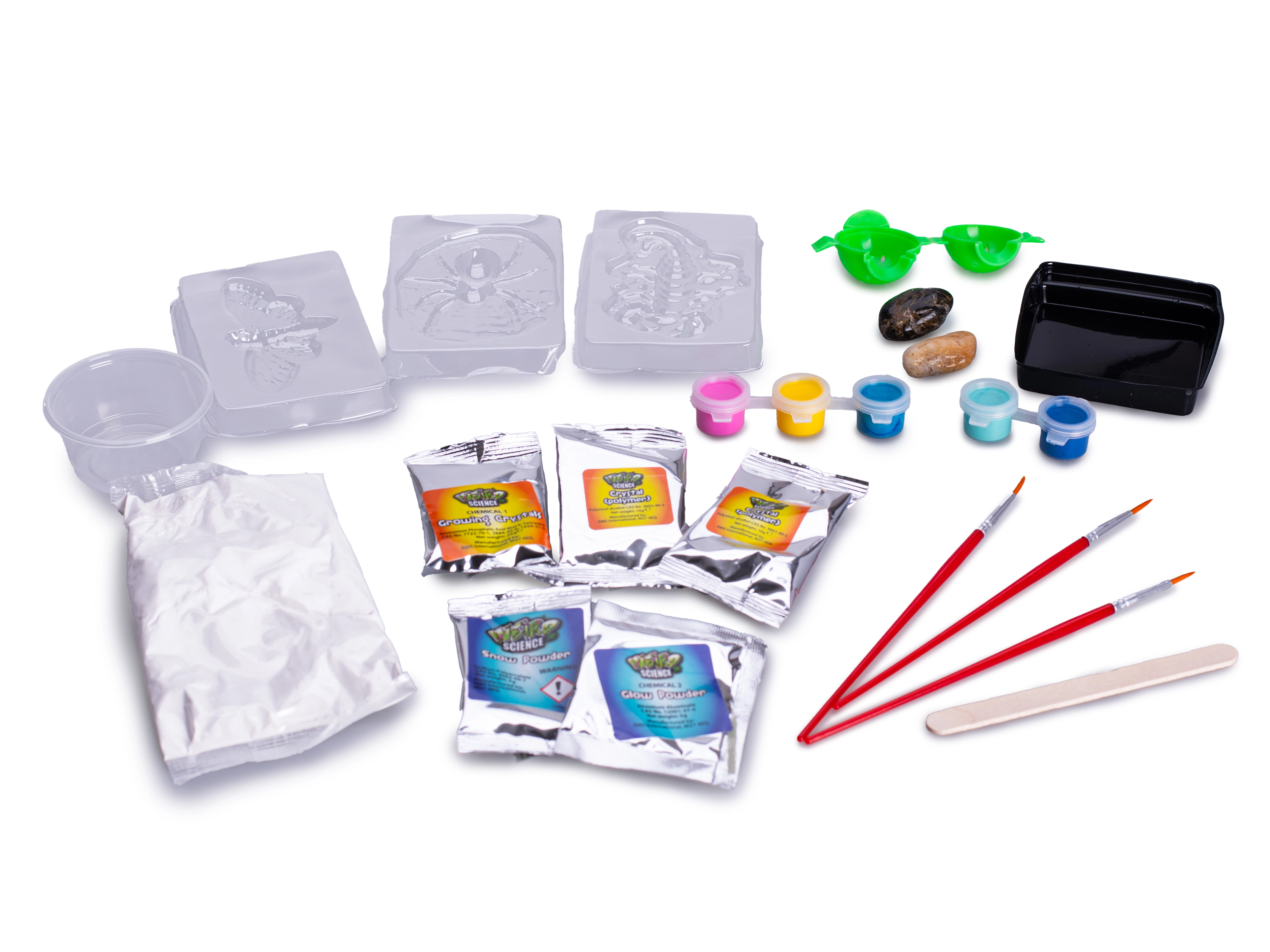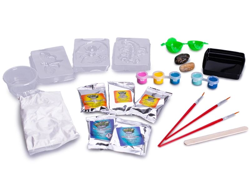 - Haak met lichtgevende stickers (1×), penseel (3×), verf (5×), polymeerkristallen (2×), mal (verschillende vormen), stenen (2×), gips (1× verpakking), mengsel voor groeiende kristallen (1×), lichtgevend poeder (1×), houten stokje (1×), PVC-onderlegger (1×), insectenmallen (3×), mengbakje (1×)