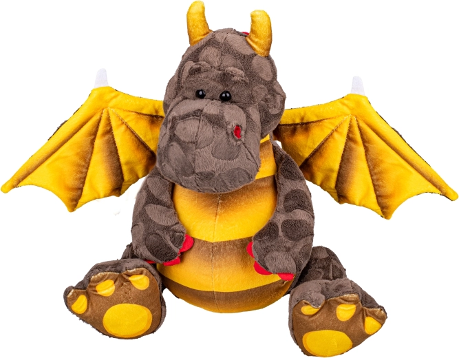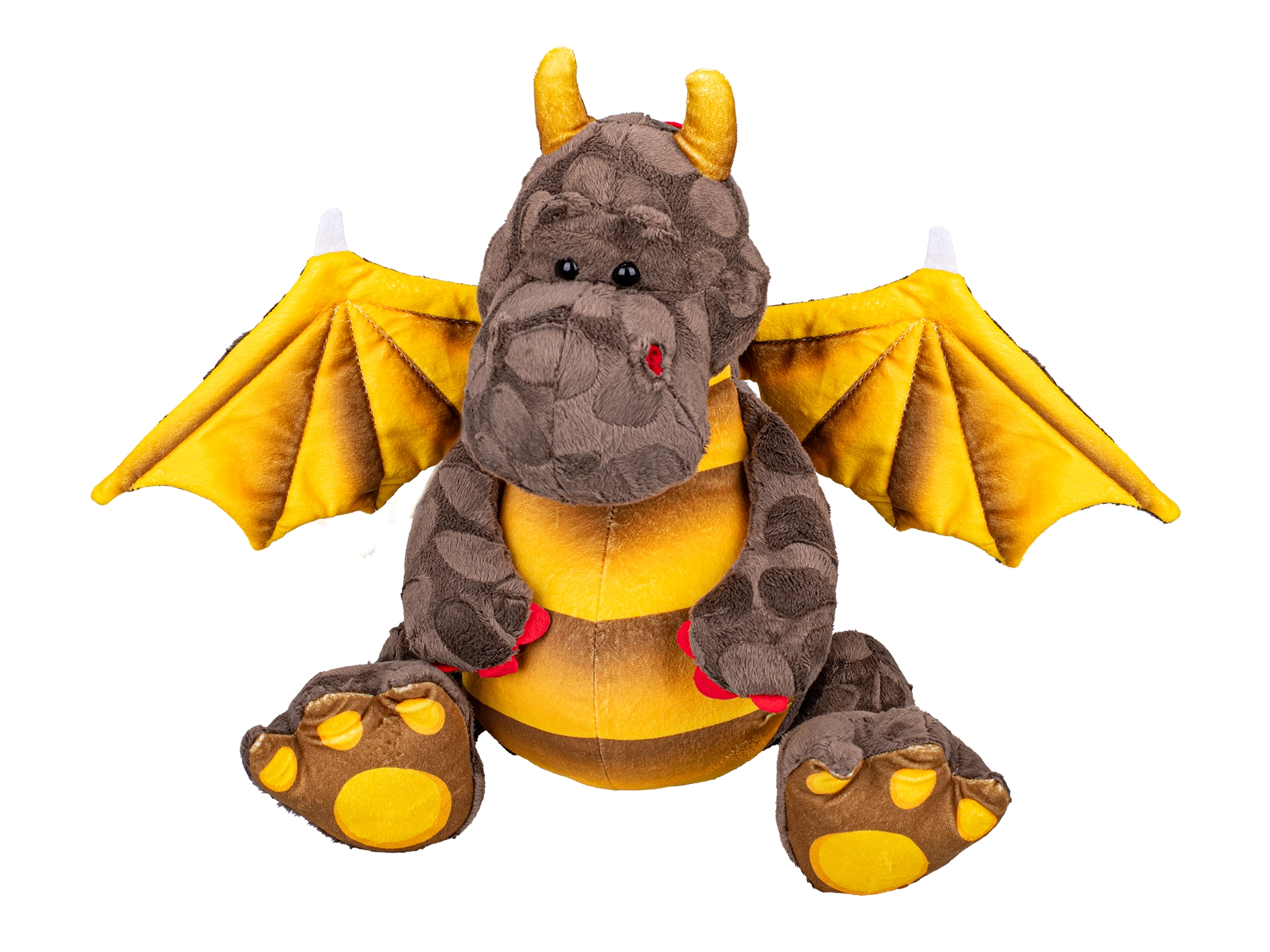 Deze bruine pluchen draak verovert snel de harten van kinderen met zijn schattige uiterlijk en zachte oppervlak. Dankzij de zittende houding behoudt hij mooi zijn vorm en staat hij prachtig in de kinderkamer. Buigzame draadjes in de vleugels en nek maken gemakkelijk vormen en spelen mogelijk, wat de fijne motoriek en de fantasie ontwikkelt.