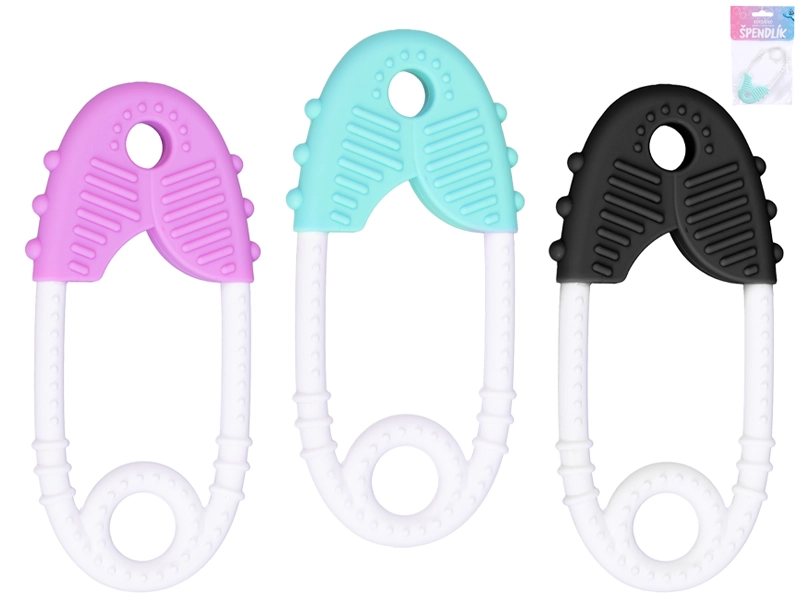Praktisch siliconen bijtspeeltje in de vorm van een veiligheidsspeld voor baby’s vanaf de geboorte, biedt verlichting voor gevoelige tandvlees en ondersteunt de ontwikkeling van de fijne motoriek. Dankzij de lichte, ergonomische vorm is het ook voor de kleinste handjes makkelijk vast te houden, terwijl het getextureerde oppervlak het tandvlees prettig masseert. Gemaakt van veilig, flexibel siliconen, eenvoudig te reinigen en verkrijgbaar in de kleuren roze, zwart en groen.