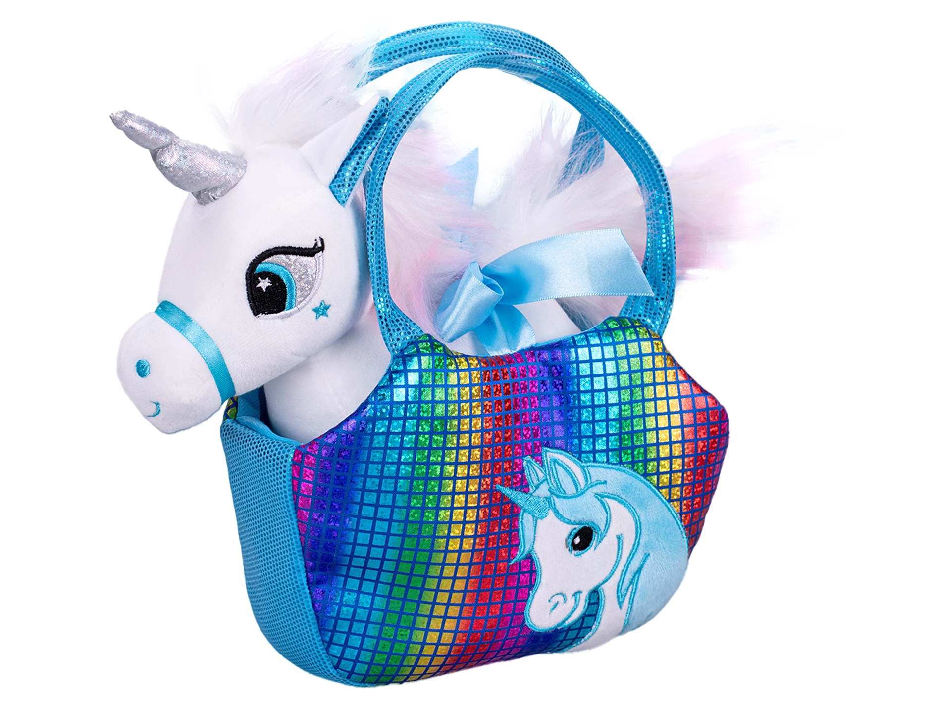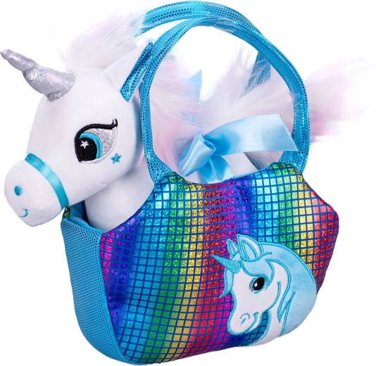 De eenhoorn heeft een universeel formaat van 22 cm dat goed in kinderhandjes past, en de handtas met afmetingen 20 × 15 cm biedt voldoende ruimte niet alleen voor het speeltje, maar ook voor kleine schatten. Keuze uit blauw, roze en groen, zodat ieder kind zijn favoriet kan vinden.