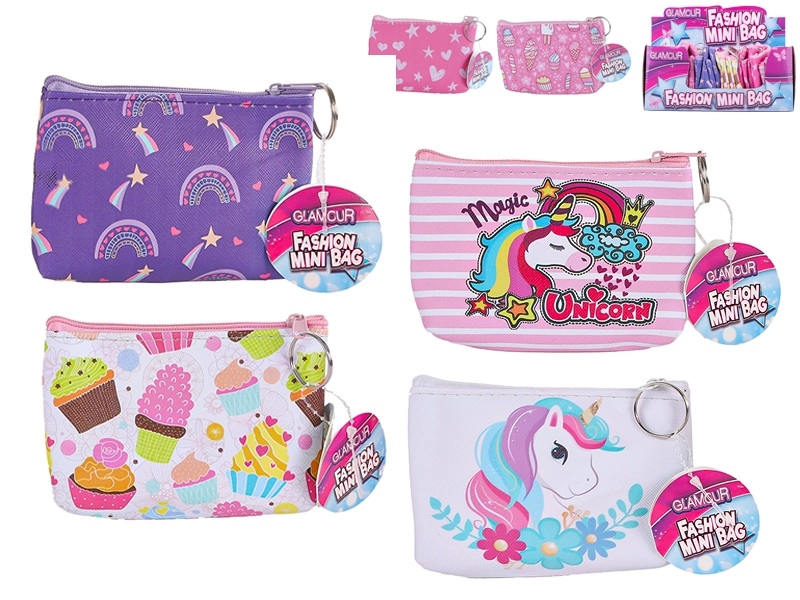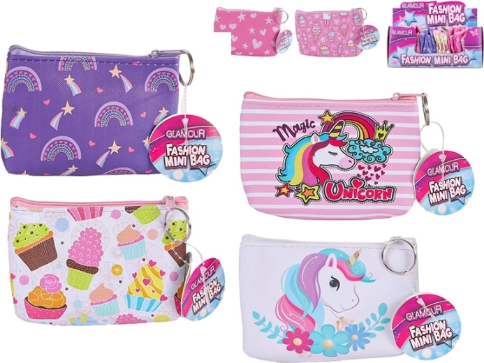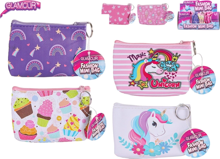 Stijlvolle en praktische Glamour portemonnee van 13 × 9 cm is de ideale metgezel voor elke dag. Dankzij het compacte formaat past hij gemakkelijk in een handtas of zak en de veilige rits beschermt je spulletjes. Verkrijgbaar in zes speelse designs met motieven van ijsjes, eenhoorns, een regenboog en hartjes, geschikt voor kinderen vanaf 3 jaar.