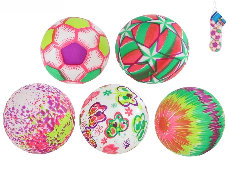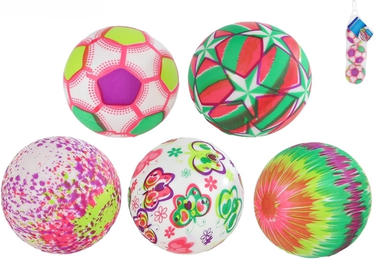 De diverse en contrasterende patronen (sterren, uitlopende stippen, uitlopende strepen, voetbalpatroon en vlinders) trekken de aandacht en stimuleren het visuele waarnemen. In de verpakking zit een praktisch net waarin je de ballen gemakkelijk meeneemt naar het speelveld of thuis opbergt.