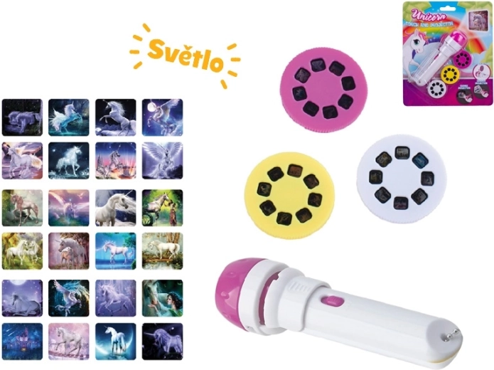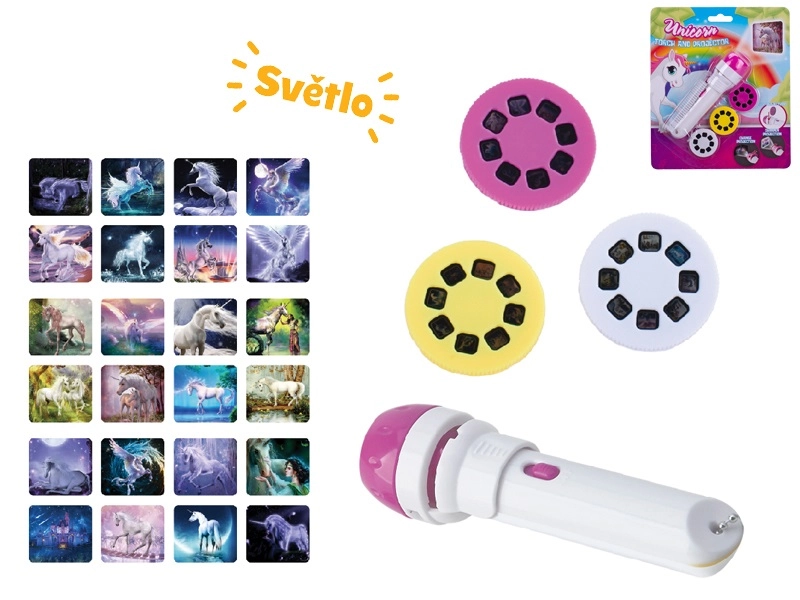 Ontdek de magische fantasiewereld met de Unicorn projectorlamp, die tot 24 afbeeldingen van eenhoorns op muren of plafond projecteert. Het compacte design met een lengte van 11,5 cm, de eenvoudige bediening en batterijen in de verpakking maken het een ideale speelaccessoire voor kinderen vanaf 3 jaar. Naast een projector fungeert het ook als een praktische zaklamp voor avondlijke avonturen.