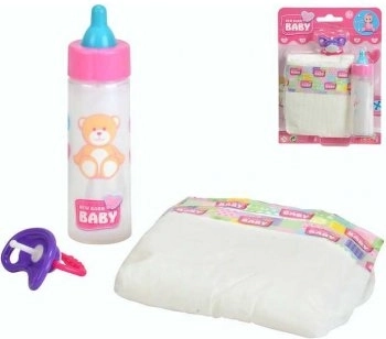 Praktische set accessoires voor poppen uit de New Born Baby-lijn bevat een speen, luier en een flesje met verdwijnende melk dat bij het “drinken” een leuk effect creëert. Ideaal voor kinderen die graag voor een baby willen zorgen. Geschikt voor poppen van 38–43 cm.