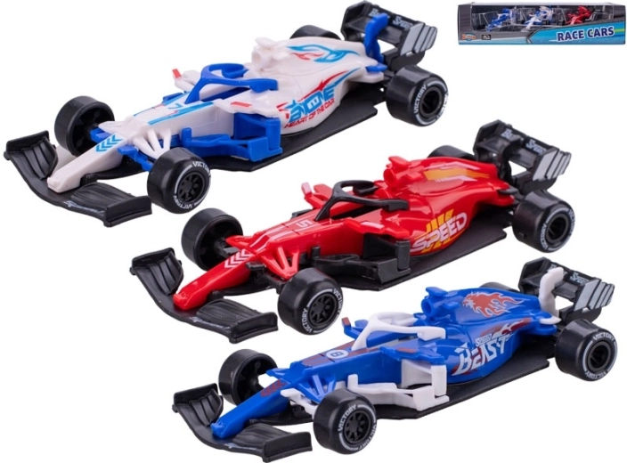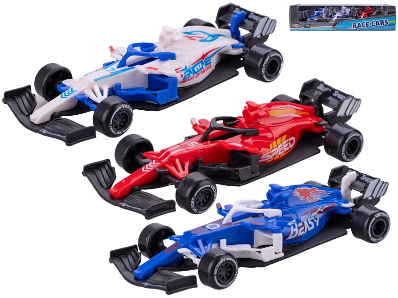 Een stijlvolle set van drie raceformulemodellen die zowel jonge coureurs als verzamelaars zal bekoren. Elk model van 12,5 cm heeft vrije wielloop voor soepel rijden, is gemaakt van duurzaam metaal met kunststof details en valt op door een aantrekkelijke kleurstelling. Verpakt in een transparante doos. Geschikt voor kinderen vanaf 3 jaar.