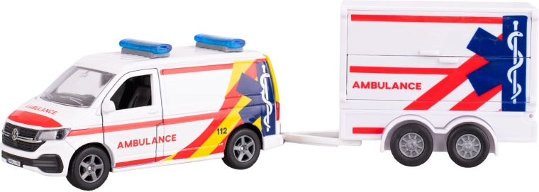 Realistisch model van de VW Transporter ambulance in schaal 1:16 dat zowel kleine als grote autofans zal verrassen. Combineert metaal en kunststof voor duurzaamheid en laag gewicht, heeft pull-back aandrijving, openslaande deuren en wordt geleverd met een aanhanger voor nog meer speelmogelijkheden. Lengte 27,5 cm, ideaal om binnen en buiten mee te spelen, geschikt voor kinderen vanaf 3 jaar.