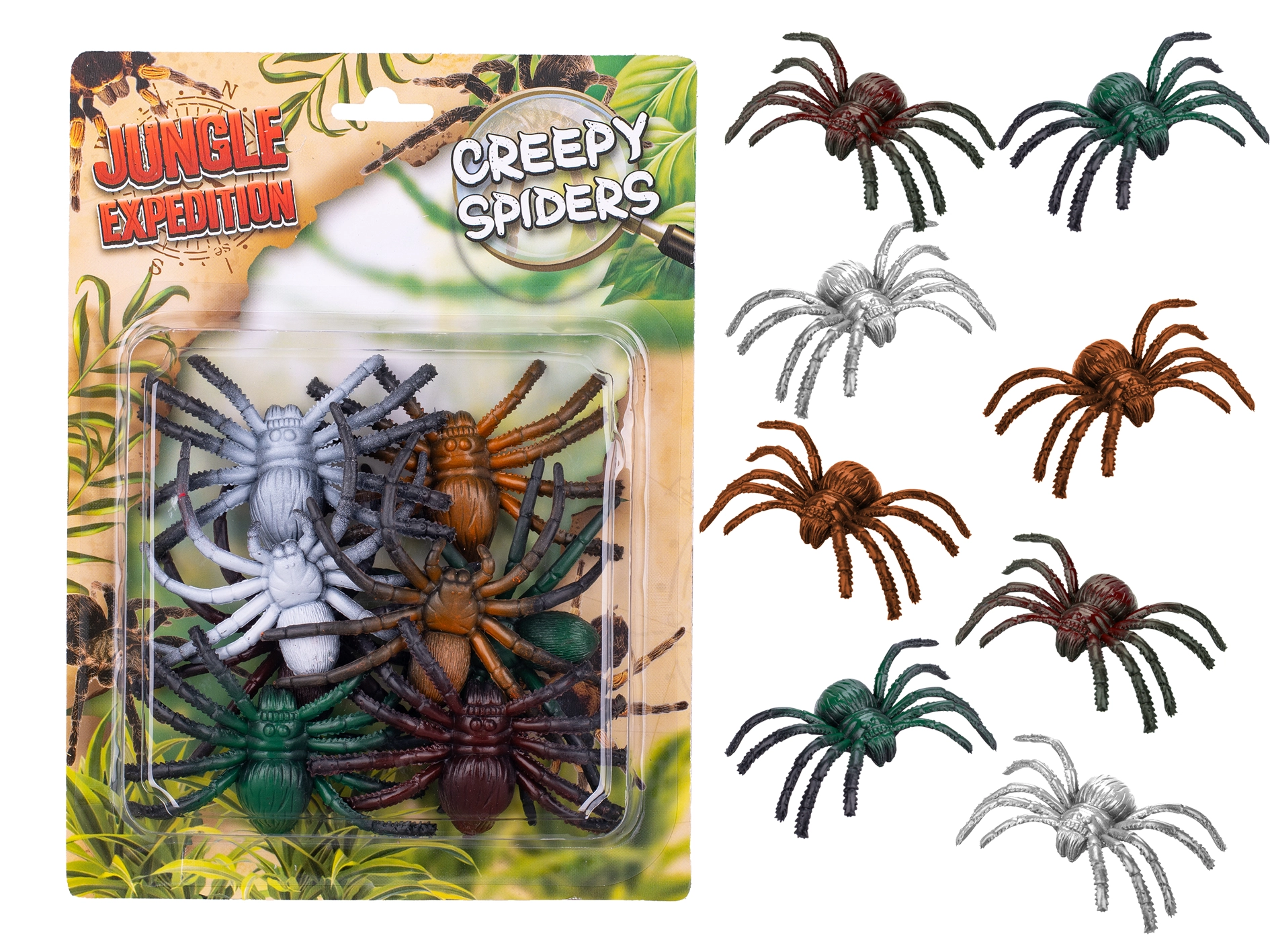 De Jungle Expedition-set bevat 8 zorgvuldig vormgegeven spinnen die echte soorten natuurgetrouw nabootsen. Dankzij de levendige kleuren en details prikkelen kinderen hun verbeelding en ontdekken zij de natuur op een speelse manier. Ideaal voor thuis, in de kinderopvang en voor educatieve activiteiten.