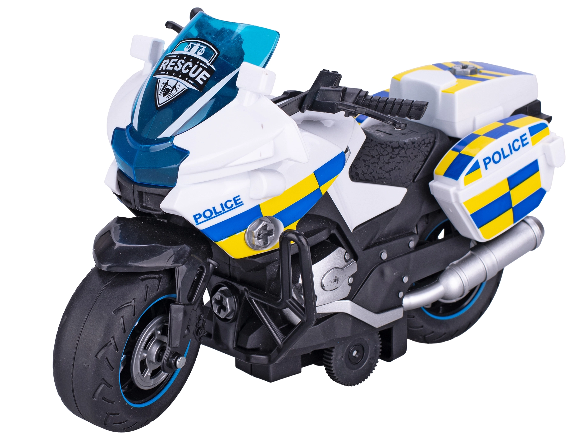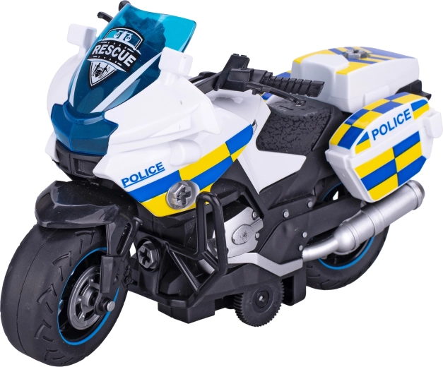 Deze plastic politie motor is ontworpen met oog voor detail en realistische elementen die de verbeelding van kinderen stimuleren. Dankzij de schroefbare onderdelen kunnen kinderen de motor zelf uit elkaar halen en weer monteren, waarmee ze handigheid en oog-handcoördinatie trainen. De vliegwielaandrijving geeft extra vaart aan het spel – na het opdraaien schiet de motor vlot naar voren.