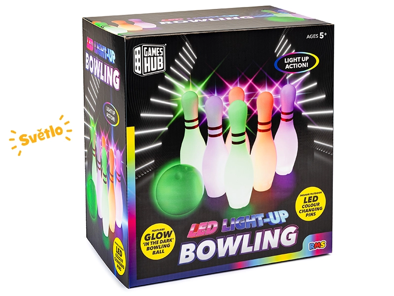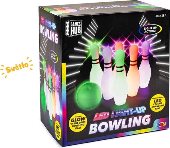 Geniet van gezinsplezier met deze bowlingset voor kinderen vanaf 5 jaar. Bevat 6 kegels van 25,5 cm hoog en een speciale bal die na activatie oplicht dankzij LED-diodes. Lichteffect geeft het spel extra magie, ook bij schemering, bevordert de motoriek en coördinatie en is dankzij de compacte afmetingen geschikt voor binnen en buiten.
