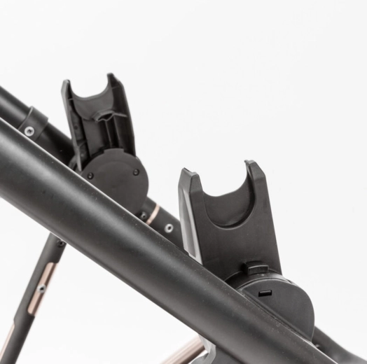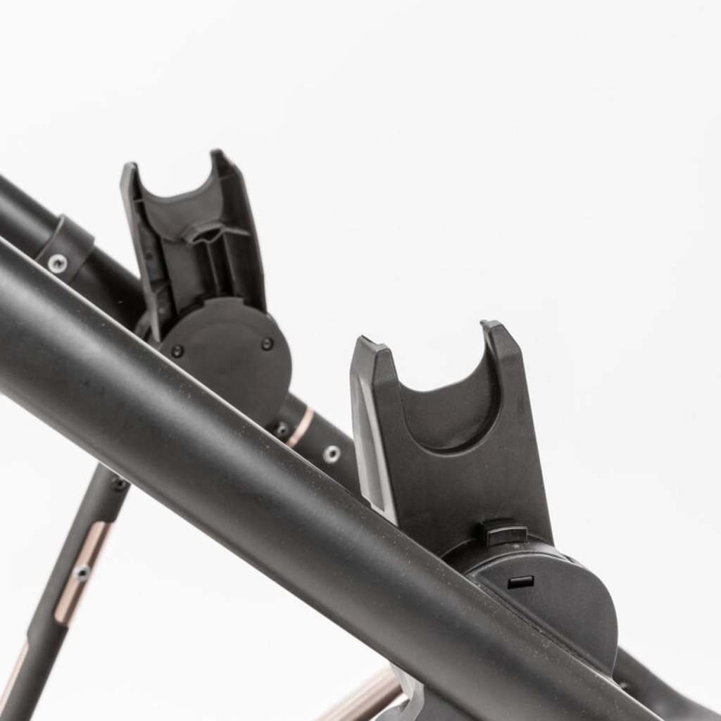 Schuif de adapters in de montagesleuven van het kinderwagenframe totdat ze hoorbaar vastklikken, klik vervolgens het autostoeltje erop. Controleer vóór elk gebruik de stevige verbinding. Voor demontage verwijder je eerst het autostoeltje volgens de handleiding en druk je op de ontgrendelknop van de adaptervergrendeling.