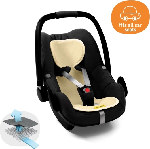 Ademend AeroMoov-inlegstuk voor autostoelen 0–13 kg zorgt het hele jaar door voor comfort voor je baby. Dankzij de 3D-honingraatstructuur biedt het maximale luchtcirculatie, vermindert het zweten en houdt het een aangename lichaamstemperatuur vast. De inleg is zacht en aangenaam aan de aanraking en aan de buitenzijde van organisch katoen, dat je op 40 °C kunt wassen.