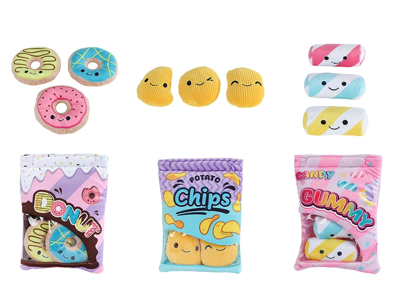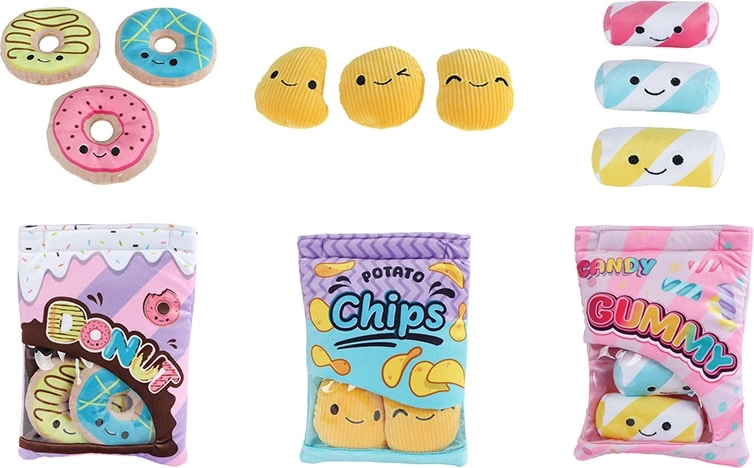 In elk zakje bevindt zich een pluche snack – je kunt kiezen uit chips, donuts en gumsnoep. Met afmetingen van ongeveer 16 × 8 × 6 cm ligt het perfect in kleine handjes en dankzij de lengte van 21 cm is het makkelijk mee te nemen. Het is ook een praktisch cadeau voor elke gelegenheid.