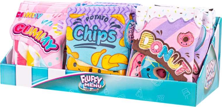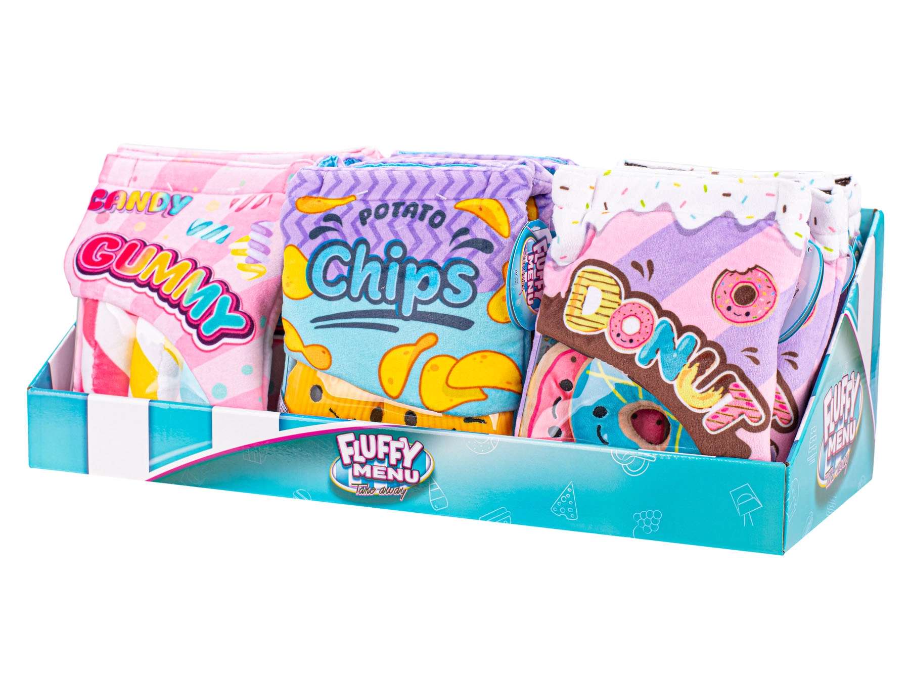 Het schattige pluchen zakje Fluffy Menu met vrolijke gezichtjes biedt kinderen plezier, zacht comfort en veilig spelen vanaf de geboorte. In elk zakje zit een pluche snack in de varianten chips, donuts of gumsnoep. Dankzij het compacte formaat past het perfect in een rugzakje of kinderwagen en is het ideaal voor onderweg.