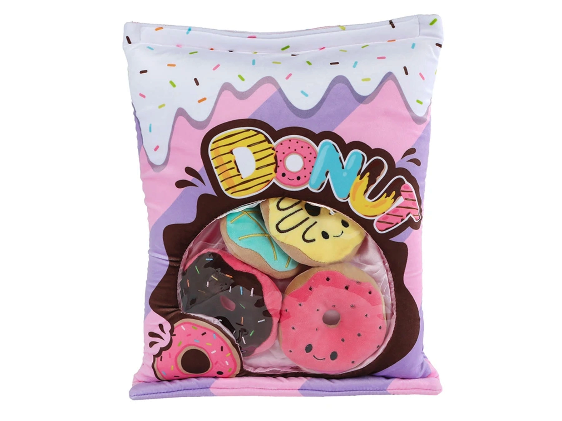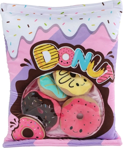 De zachte pluchen tas dient niet alleen als verpakking, maar ook als praktische organizer – kinderen leren speelgoed op te ruimen, te sorteren en orde te houden. De texturen en vormen van de donuts ondersteunen het tactiele bewustzijn, de ontwikkeling van de fijne motoriek en de oog-handcoördinatie vanaf zeer jonge leeftijd.