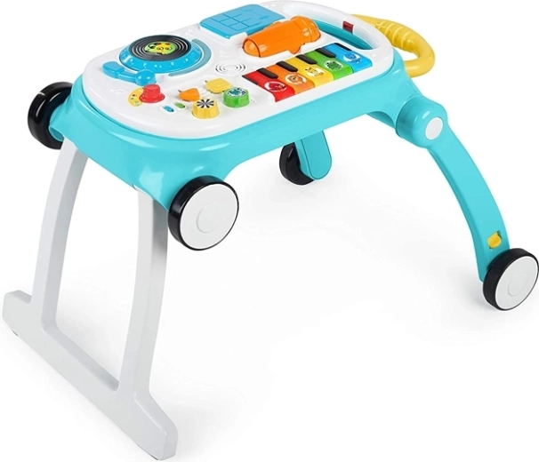 Het afneembare paneel kan zittend op de vloer worden gebruikt, later als onderdeel van de loopwagen voor de eerste stapjes en vervolgens als zelfstandig muziekpaneel of creatieve tafel. De stabiele constructie, het inklapbare design en het brede scala aan activiteiten (knoppen, schuivers, wieltjes, mini-toetsen) garanderen langdurig en zinvol spel.