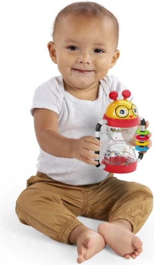 Ontdek de speelse Baby Einstein Cal’s Sensory Shake‑Up rammelaar, die multisensorisch spel, ondersteuning van de fijne motoriek en oorzaak‑gevolg leren combineert. Twee makkelijk vast te pakken handgrepen, een transparant deel met kraaltjes als in een zandloper, een draaiend hoofdje met klikgeluid, een veilig spiegeltje en 4 rammelende ringetjes houden de aandacht van je baby vast, thuis en onderweg. BPA‑vrij en zonder batterijen.