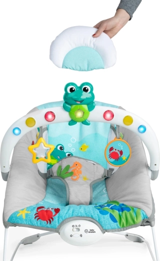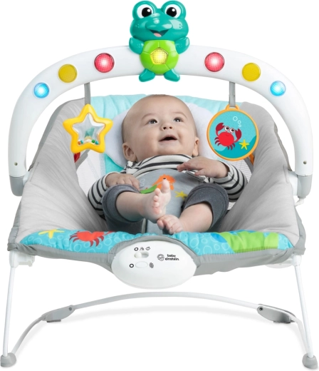 Het BABY EINSTEIN Ocean Explorers Kick to It Neptune ligstoeltje is ontworpen voor ontspanning en zintuiglijke stimulatie. Het interactieve speeltje met een kikker en spiegeltje, de rammelaar in de vorm van een ster en de kleurrijke lintjes ondersteunen de fijne motoriek, het visuele waarnemen en zelfontdekking. Geïntegreerde vibraties en melodieën helpen je baby te kalmeren, terwijl het stabiele frame en de veiligheidsgordel zekerheid bieden tijdens rust en spel.