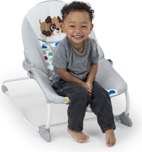 De BABY EINSTEIN Dean's Discovery Spot wipstoel kalmeert en vermaakt – van pasgeborene tot peuter. Met de standaard geactiveerd fungeert hij als een stabiele zit; na deactivering verandert hij in een zachte schommelstoel. De ingebouwde module biedt meer dan 20 minuten vibraties en klassieke muziek met volumeregeling (laag/hoog), zodat je gemakkelijk een ontspannen sfeer creëert gedurende de dag.