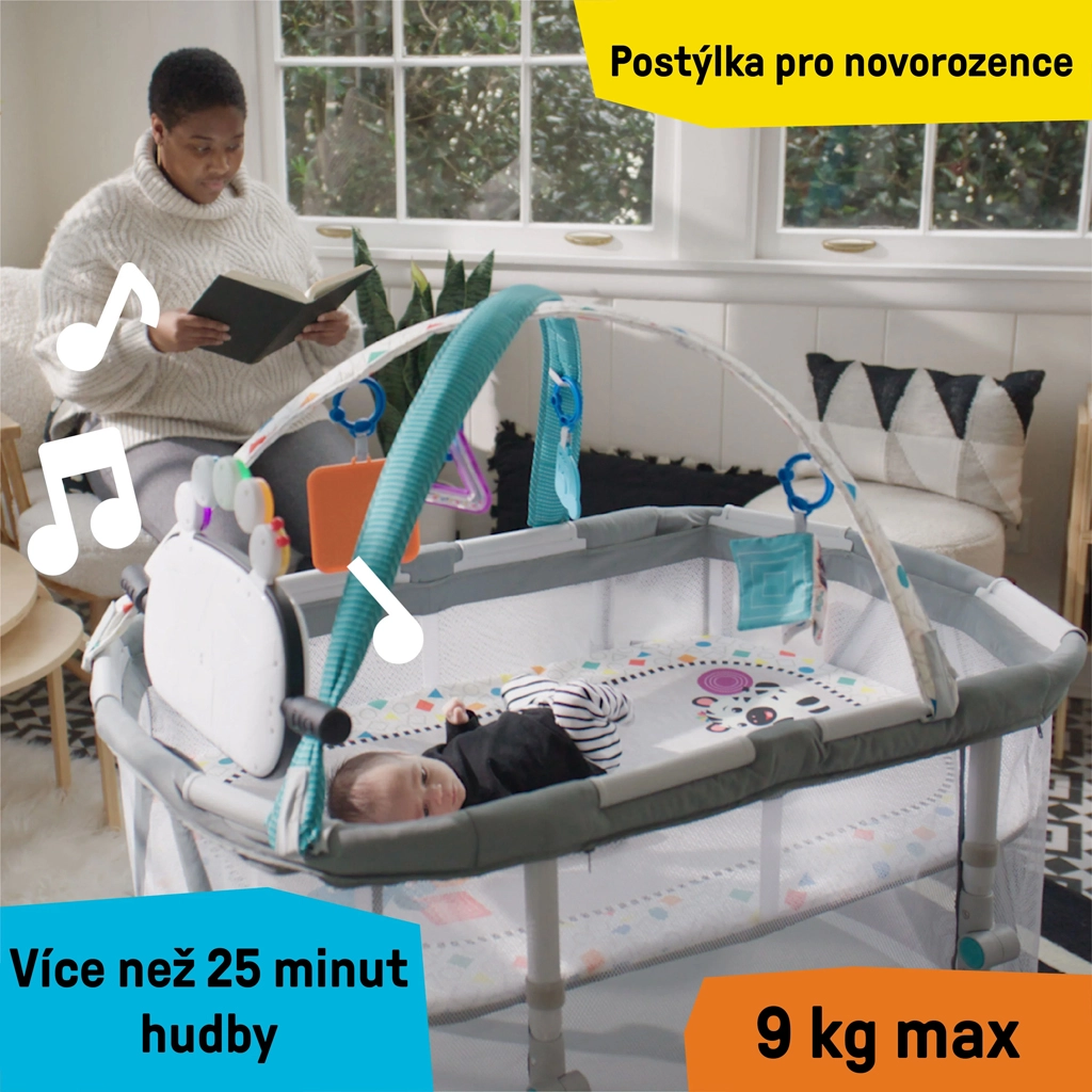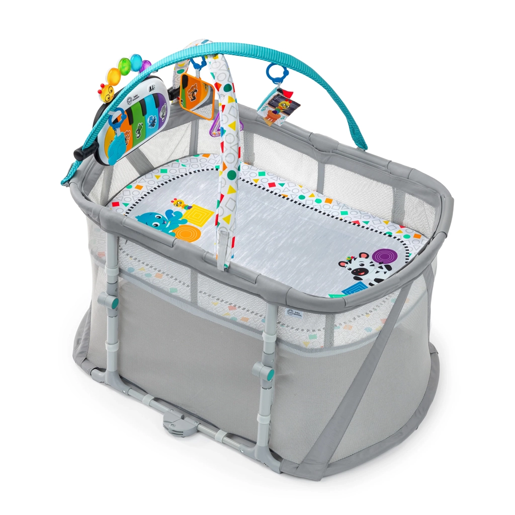 Ontdek een flexibel zorg- en speelsysteem met de Baby Einstein Kick & Snooze 3-in-1. In de wiegmodus krijgt je baby een knusse en veilige slaapplaats met rustgevende muziek en zachte lichtjes. Naarmate je kind groeit, schakel je eenvoudig over naar de activity gym voor buikspeeltijd en zintuiglijke ontwikkeling, of naar de playard/speelbox voor veilig, zelfstandig spelen.