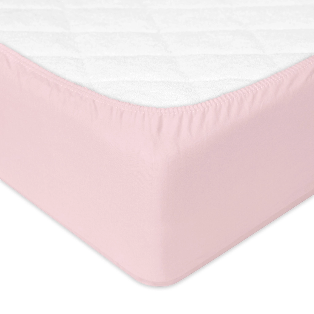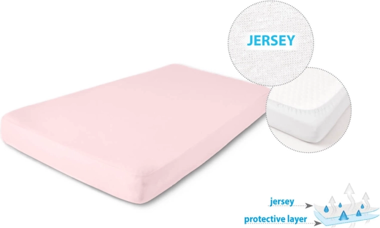 Praktisch en zacht hoeslaken voor een babybed van 60 × 120 cm in een delicate roze kleur. Dankzij de innovatieve tunnel met elastiek zit het stevig om het matras en schuift het niet, terwijl de waterdichte onderlaag het matras tegen vocht beschermt. De bovenzijde van zachte 100% katoen is mild voor de gevoelige babyhuid.