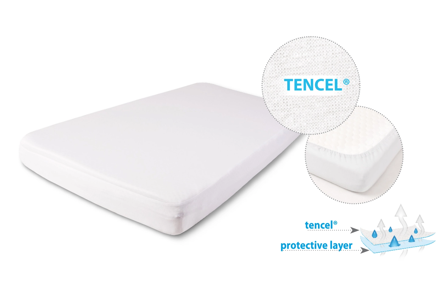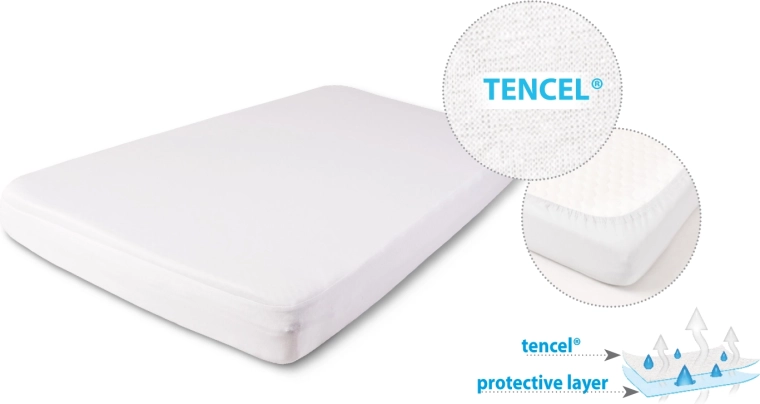 Praktisch en comfortabel hoeslaken van Tencel-vezel met een waterdicht en tegelijk ademend membraan dat de matras beschermt tegen vocht en vlekken. Dankzij de ingestikte elastiek blijft het perfect op zijn plek, is het zacht voor de huid, anti-allergisch en geschikt voor kinderbedjes.