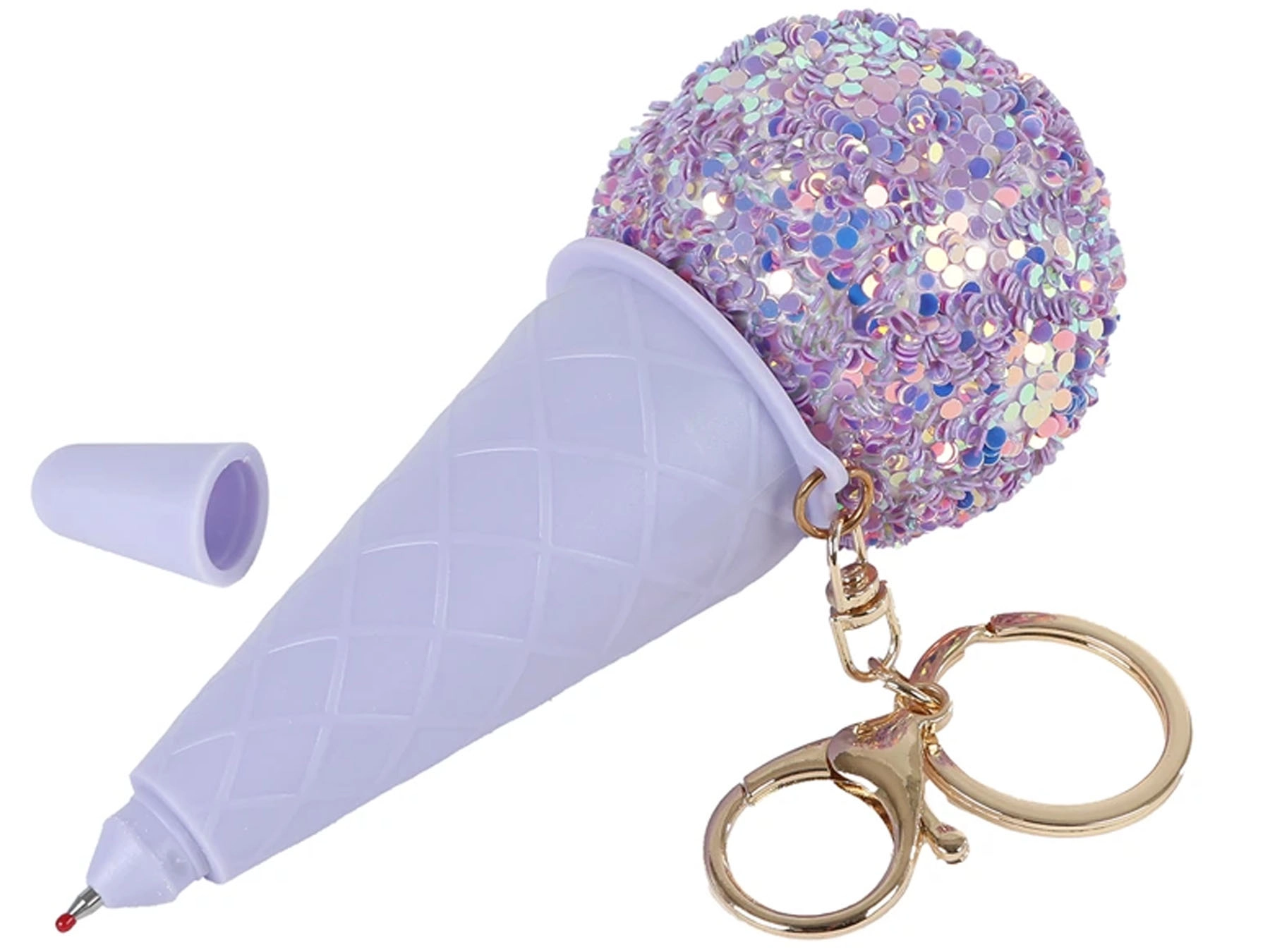 Stijlvolle Glamour sleutelhanger in de vorm van een ijsje combineert een praktische pen met een speels design. Gemaakt van duurzaam plastic, ongeveer 14 cm lang en door het glinsterende paarse oppervlak direct een blikvanger. Makkelijk te bevestigen aan sleutels, rugzak of handtas en een geweldig klein cadeautje voor kinderen vanaf 3 jaar en speelse volwassenen.