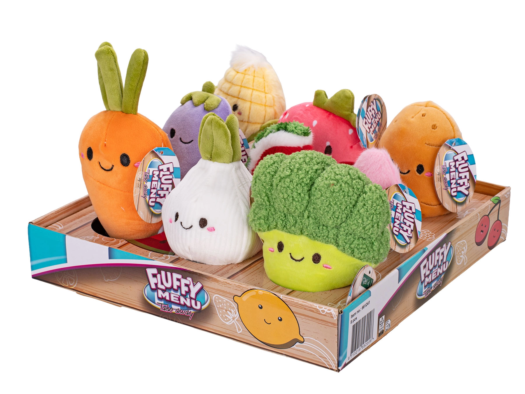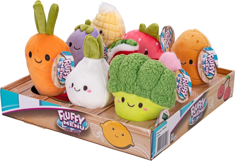 Er zijn 9 soorten om uit te kiezen: broccoli, maïs, aardappel, watermeloen, ui, aardbei, aubergine, wortel en radijs. Elke knuffel wordt afzonderlijk geleverd, wat zorgt voor een vrolijk verrassingseffect bij het uitpakken. Vrolijke uitdrukkingen en opvallende kleuren ontwikkelen de verbeelding en motiveren kinderen tot spelenderwijs leren over gezonde voeding.