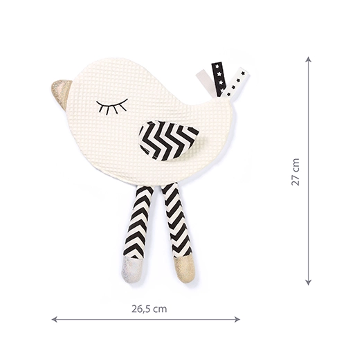 De Little Birdie knuffeldoek uit de BabyOno Blink&Smile-collectie combineert zachtheid, veiligheid en zintuiglijke stimulatie waar baby’s dol op zijn. Contrasterende zwart-witte elementen trekken de aandacht van pasgeborenen, terwijl zachte textielen en labeltjes uitnodigen om met de vingertjes te ontdekken. Het lichte, makkelijk vast te pakken ontwerp is perfect voor de kinderwagen, het bedje en onderweg.