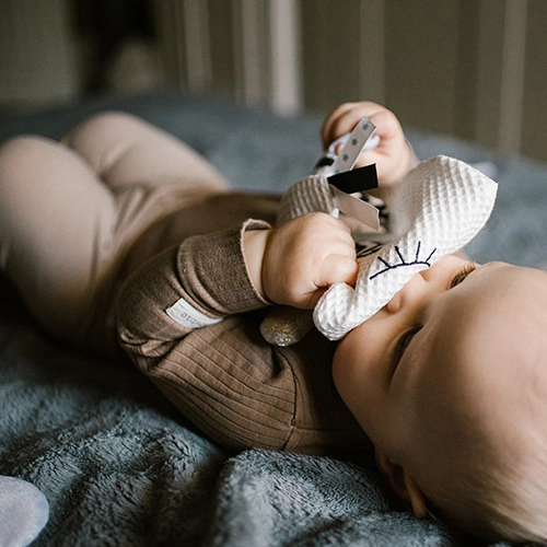 Bij het vastpakken maakt de speelgoeddoek een zacht geluid, terwijl de verschillende texturen en labeltjes de tastzin en oog-handcoördinatie stimuleren.