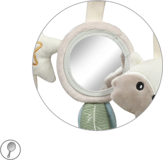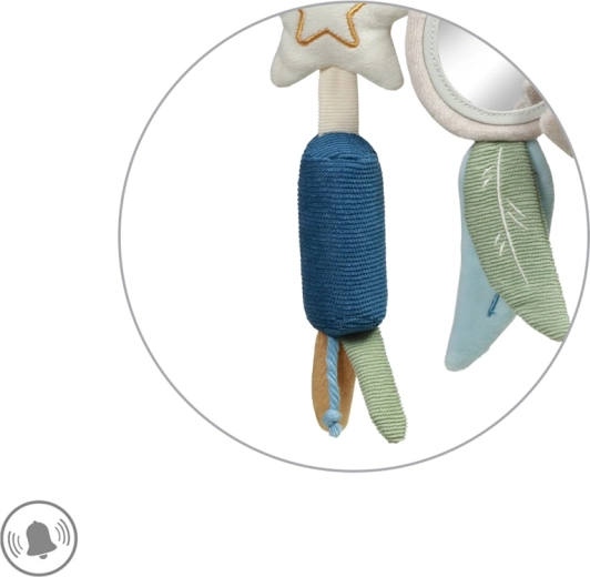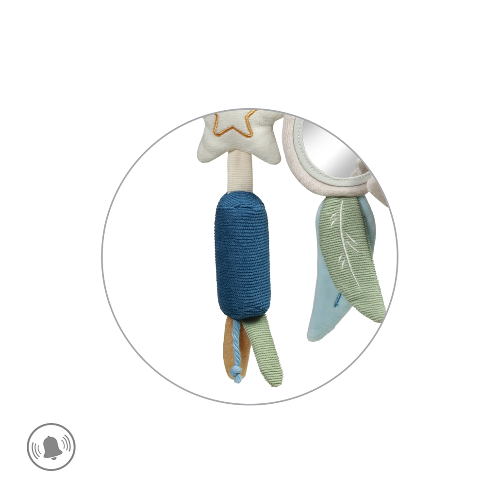 Het spiegeltje, verschillende texturen, knisperende elementen en zachte belletjes ondersteunen de ontwikkeling van zicht, tast, gehoor en fijne motoriek.