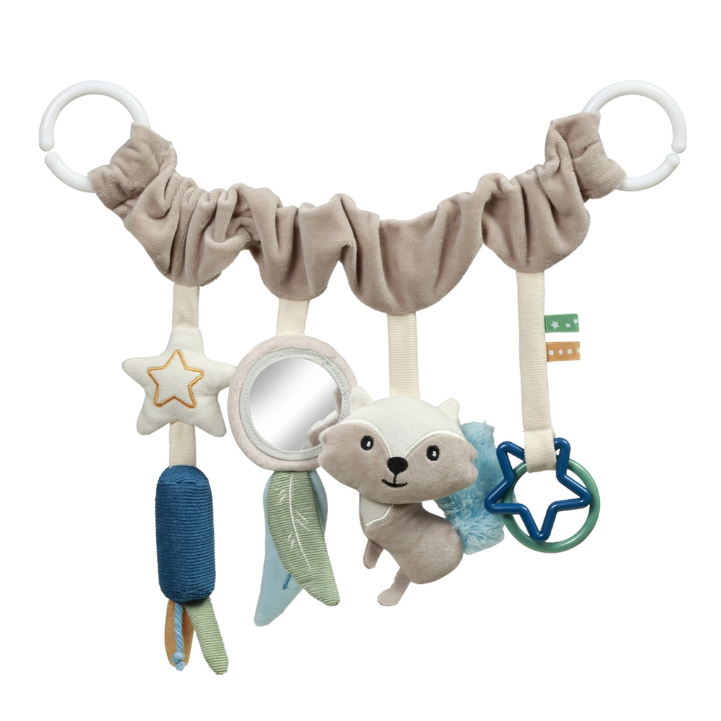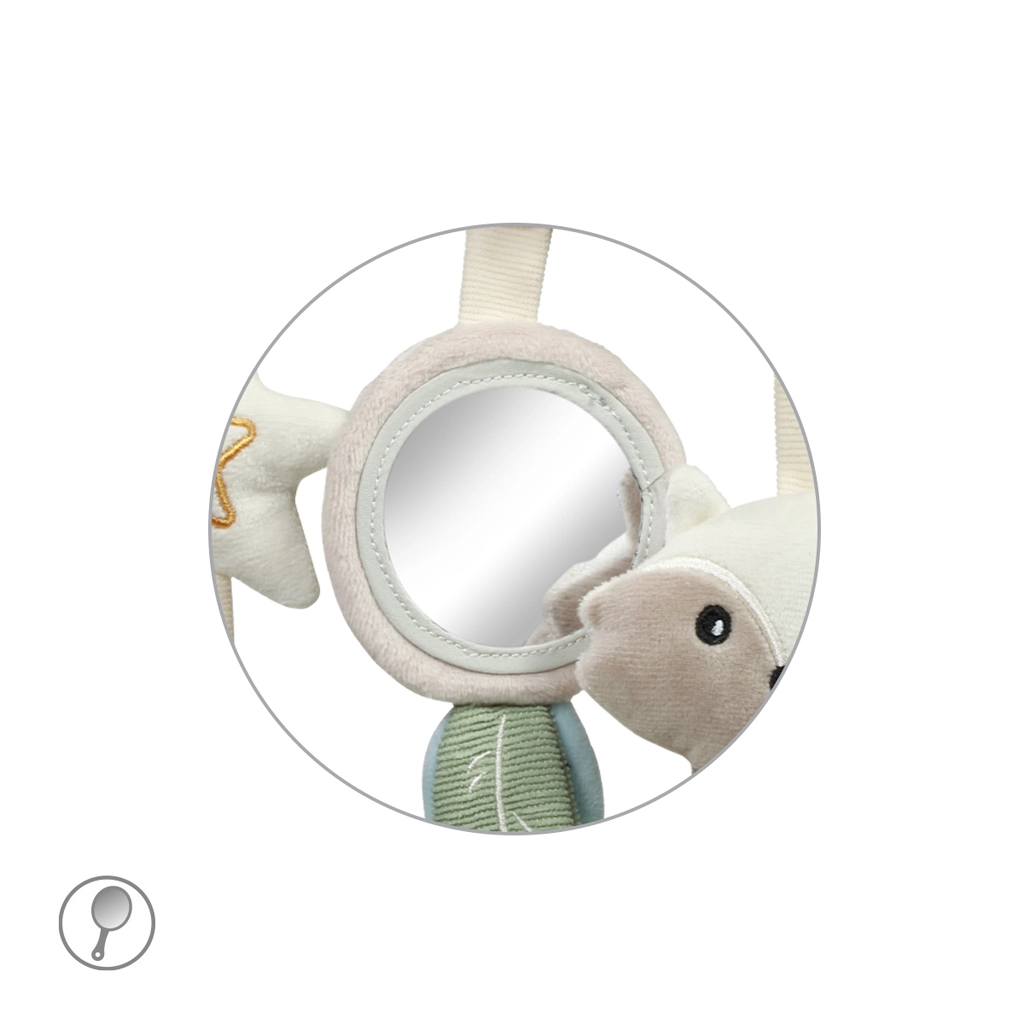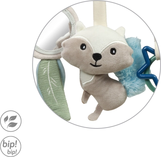 Onderdeel van de set zijn populaire elementen: een flexibel spiegeltje om de eigen reflectie te ontdekken, knisperende blaadjes en de staart van de wasbeer om de aandacht te trainen, zacht klingelende belletjes om te kalmeren en een stervormige bijtring voor verlichting bij doorkomende tandjes. Doordachte details houden de aandacht van je kind vast en stimuleren de hand-oogcoördinatie.