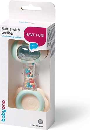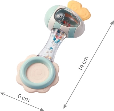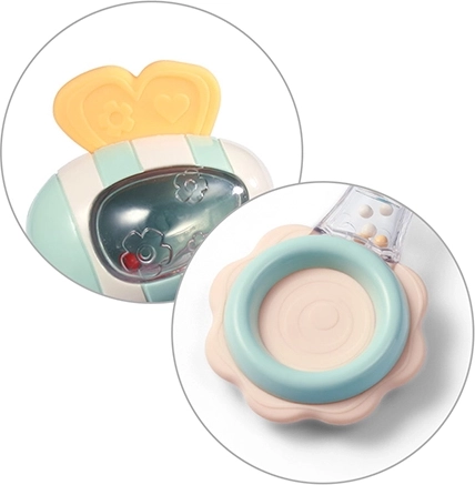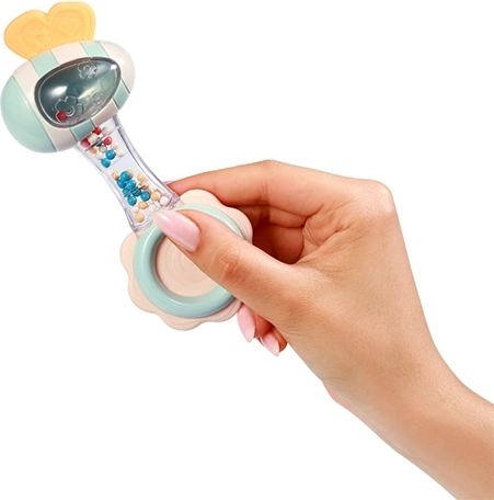 Veilige materialen die prettig aanvoelen en een doordachte vorm zorgen voor comfortabel vasthouden, zelfs voor de allerkleinsten. Het transparante deel met gekleurde kraaltjes creëert een rustgevend geluid dat de aandacht trekt en het gehoor stimuleert. De siliconen bijtring masseert zacht het tandvlees en helpt bij ongemak tijdens de groei van tandjes.