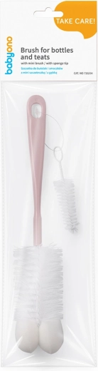Praktische BabyOno borstel voor grondige reiniging van babyflessen en spenen. Speciaal gevormde haren bereiken ook moeilijk toegankelijke plekken, een comfortabele handgreep zorgt voor een zekere grip en de spons aan het uiteinde vergemakkelijkt het reinigen van de bodem van de fles. Inclusief een mini borsteltje voor spenen en een handig opbergsysteem.