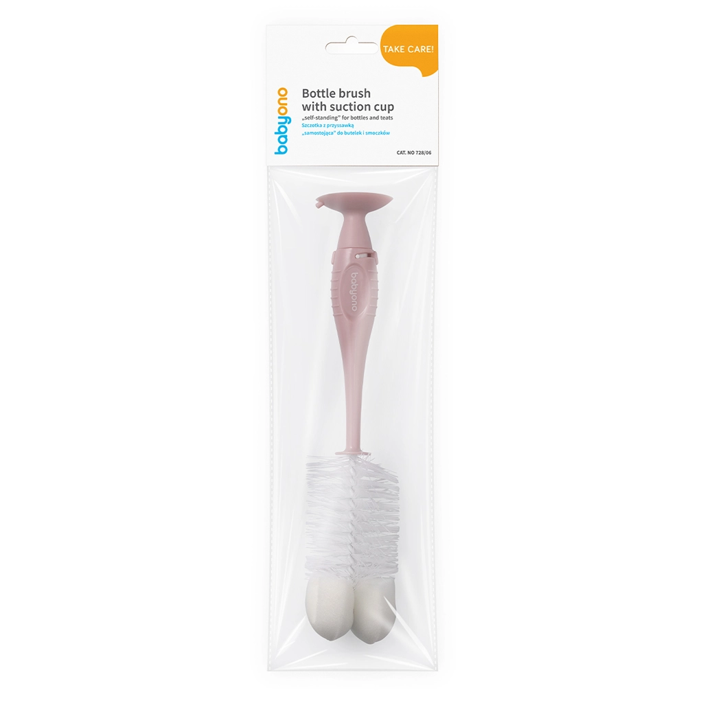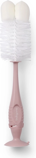 Praktische BABYONO borstel voor flessen en spenen met een zuignap voor eenvoudig neerzetten en drogen. Heeft een zachte sponspunt voor grondige reiniging van de bodem, een verborgen miniborsteltje voor spenen in het handvat en een comfortabele ergonomische greep voor een zekere bediening.