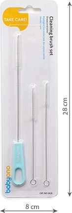 De BabyOno borsteltjesset is een ideale keuze voor grondige reiniging van de binnenkant van rietjes, tuitjes, spenen en kleinere onderdelen van oefenbekers en babyflessen. Drie verschillende maten laten je precies dat borsteltje kiezen dat het beste past bij jouw type beker of fles.