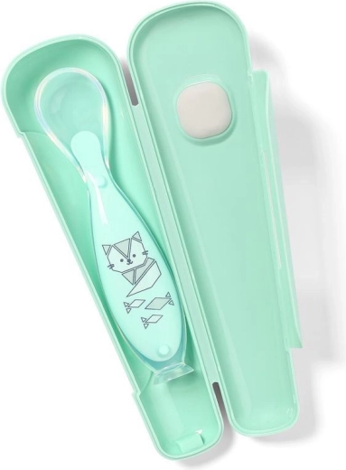 Met deze lepel wordt voeren eenvoudiger en hygiënischer. De zachte siliconen kop is mild voor gevoelig tandvlees en de eerste tandjes, terwijl de zuignap het mogelijk maakt de lepel neer te zetten zonder contact met een vuil oppervlak. De compacte etui houdt de lepel schoon in je handtas, luiertas en tijdens het reizen.