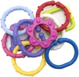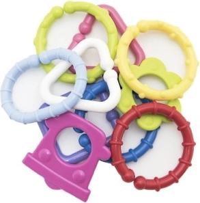 Deze set kleurrijke kunststof vormen is een ideale eerste speelgoedset voor baby’s. De onderdelen klikken eenvoudig in elkaar en blijven stevig zitten, zodat kinderen steeds opnieuw kettingen en eenvoudige constructies kunnen bouwen. Verschillende texturen en kleuren zorgen voor rijke sensorische stimulatie en het rammelende effect boeit en kalmeert.