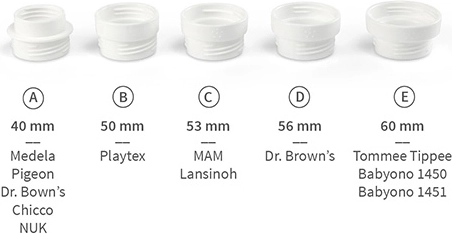 Inbegrepen zijn vijf verwisselbare adapters (40–60 mm) voor merken zoals Medela, Chicco, NUK, Dr. Brown’s, Pigeon, Playtex, MAM, Lansinoh, Tommee Tippee en meer. 43 mm flessen (Avent, BabyOno 402/403) kunnen zonder adapter worden aangesloten.