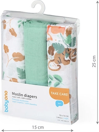 Praktische set van drie hydrofiele doeken van 100% katoen voor de dagelijkse verzorging van je baby. De doeken zijn extra zacht, ademend en zacht voor de gevoelige huid. Dankzij het universele formaat 70 × 70 cm gebruik je ze voor verschonen, afvegen, als voedingscover, als lakentje of als lichte handdoek. Stijlvolle uitvoering in mint met subtiele prints die perfect bij de uitzet passen.