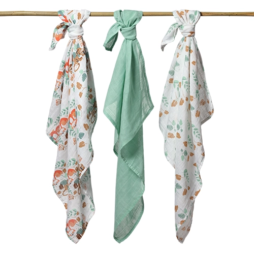 De veelzijdigheid komt thuis en onderweg van pas: als luier, handdoek, licht dekentje, slab, onderlegger of kinderwagenzonwering. De set bevat drie stuks in bijpassende designs – twee met natuurlijke print en één effen mint, zodat ze bij de uitzet passen en altijd binnen handbereik zijn.