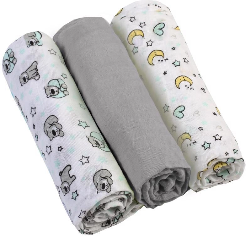 De veelzijdigheid komt elke dag van pas – van verschonen en het kalmeren van de baby tot het afdekken van de kinderwagen of discreet voeden. De set bevat 3 stuks in het formaat 70 × 70 cm, twee met een decoratieve print in neutrale grijstinten, geschikt voor zowel meisjes als jongens.