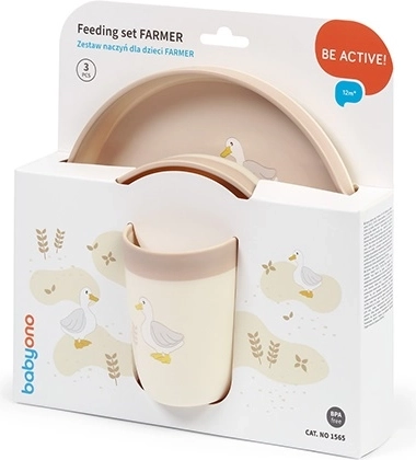 Praktische Babyono Farmer kinderserviesset voor kinderen vanaf 12 maanden, met een bord, kom en open beker om zelfstandig eten te oefenen. Licht en duurzaam PP-plastic, een antislipbodem op alle onderdelen en afgeronde randen die zacht zijn voor het tandvlees helpen rommel te beperken en zorgen voor comfort en veiligheid bij elke maaltijd. Leren drinken uit een open beker bevordert op natuurlijke wijze de coördinatie, versterkt de mondspieren en ondersteunt gezonde gewoonten.