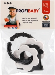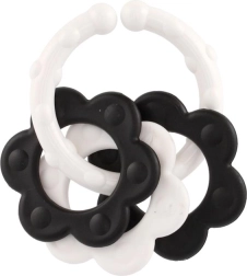 Praktische zwart-witte bijtringen in 4 vormen met geïntegreerde rammelaar en comfortabel handvat ondersteunen de ontwikkeling van het zicht en de fijne motoriek vanaf de geboorte. Gemaakt van gezondheidsveilige materialen, geschikt voor dagelijks gebruik.