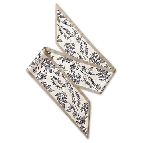 Het materiaal bestaat uit 100% gerecycled polyester (GRS) van PET-flessen, dat duurzaam en onderhoudsvriendelijk is. De stijlvolle sjaal met bloemmotief kun je aan het oor van de tas, in je haar of om je hals knopen – zo geef je je outfit een originele touch.
