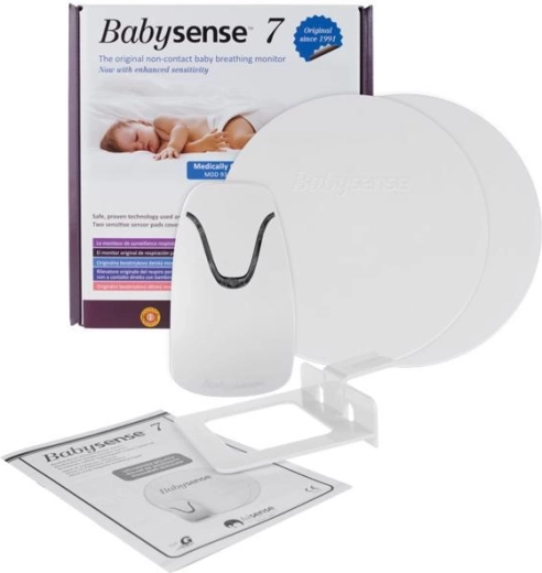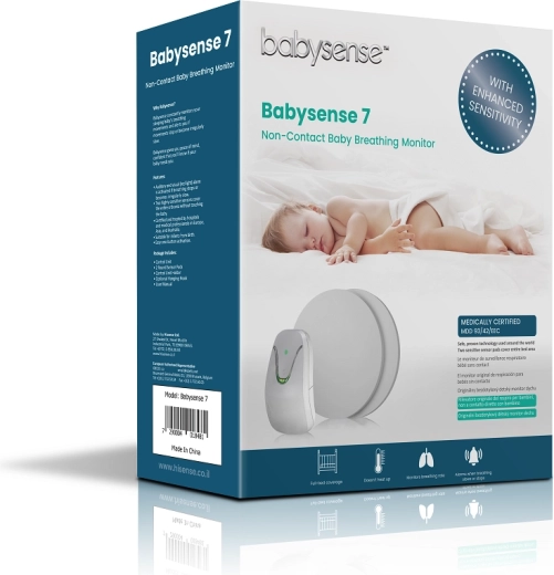 Babysense 7 is een moderne, contactloze ademhalingsmonitor, ontwikkeld voor maximale veiligheid van kinderen thuis en in zorginstellingen. Twee gevoelige sensorpanelen registreren ademhalingsbewegingen door de matras heen tot een dikte van 12 cm en de gegevens worden geanalyseerd door een compacte microprocessor in de controle-unit. Als er langer dan 20 seconden geen ademhaling wordt gedetecteerd of de ademfrequentie onder 10 ademhalingen per minuut daalt, wordt een krachtig geluids- (85 dB) en lichtalarm geactiveerd.